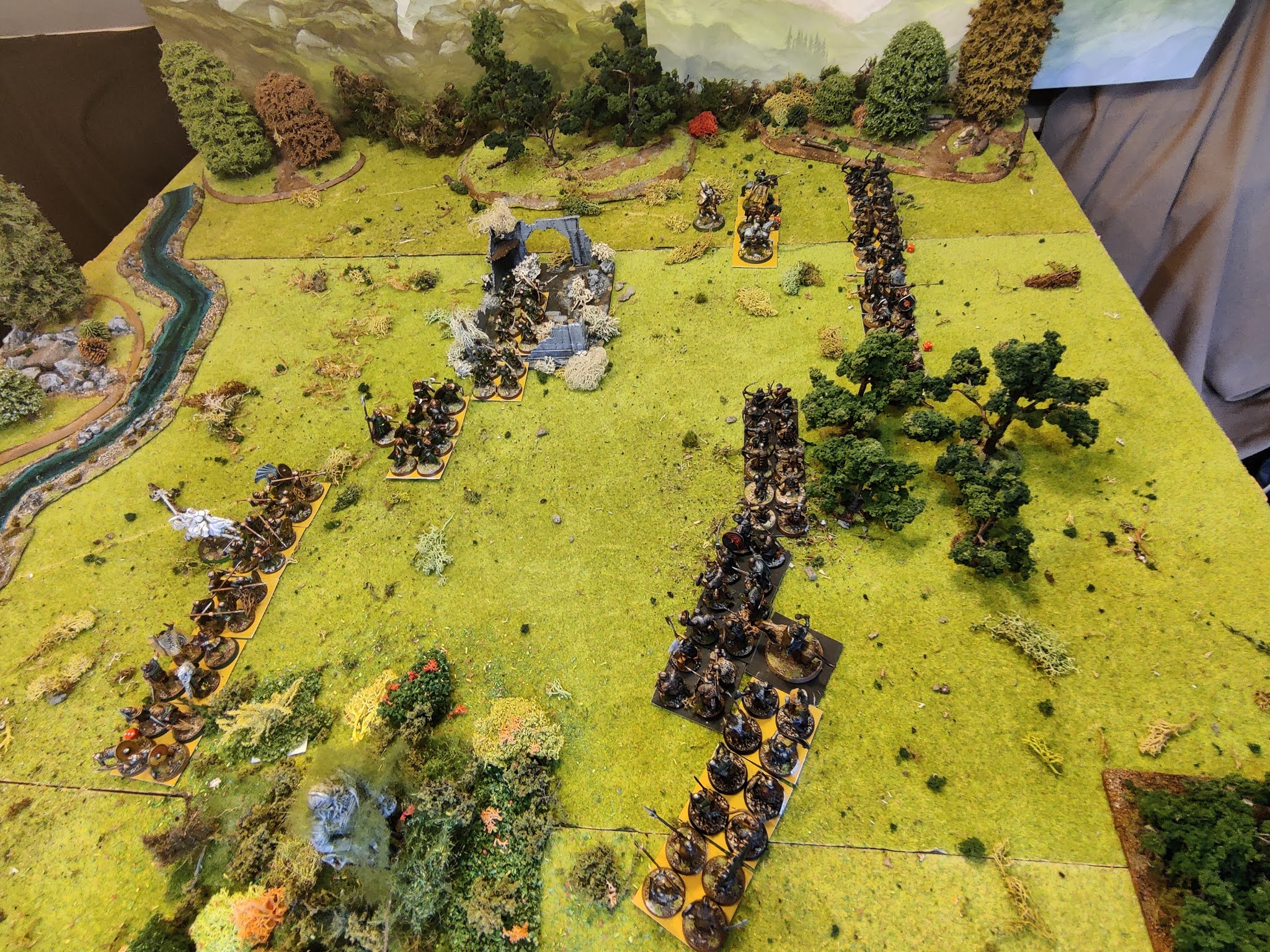 Noblig holds his Snagas back in the wood in the centre while the tardy Orcses, Orcarchers and Rabble play catch up