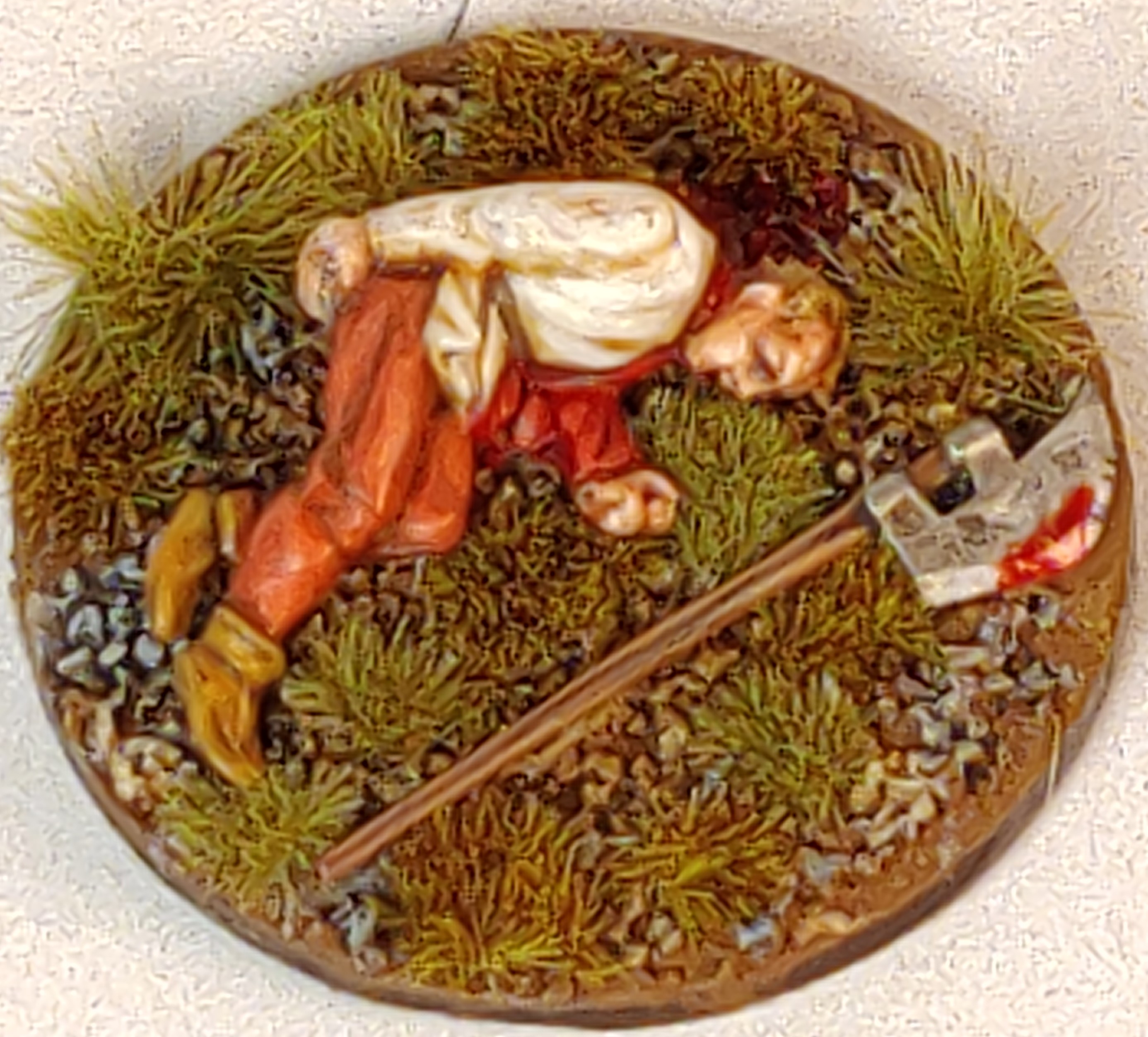 Face down and out! Finished in a surcoat of Murray! Citadel’s Khorne Red mixed with foundry Terracotta