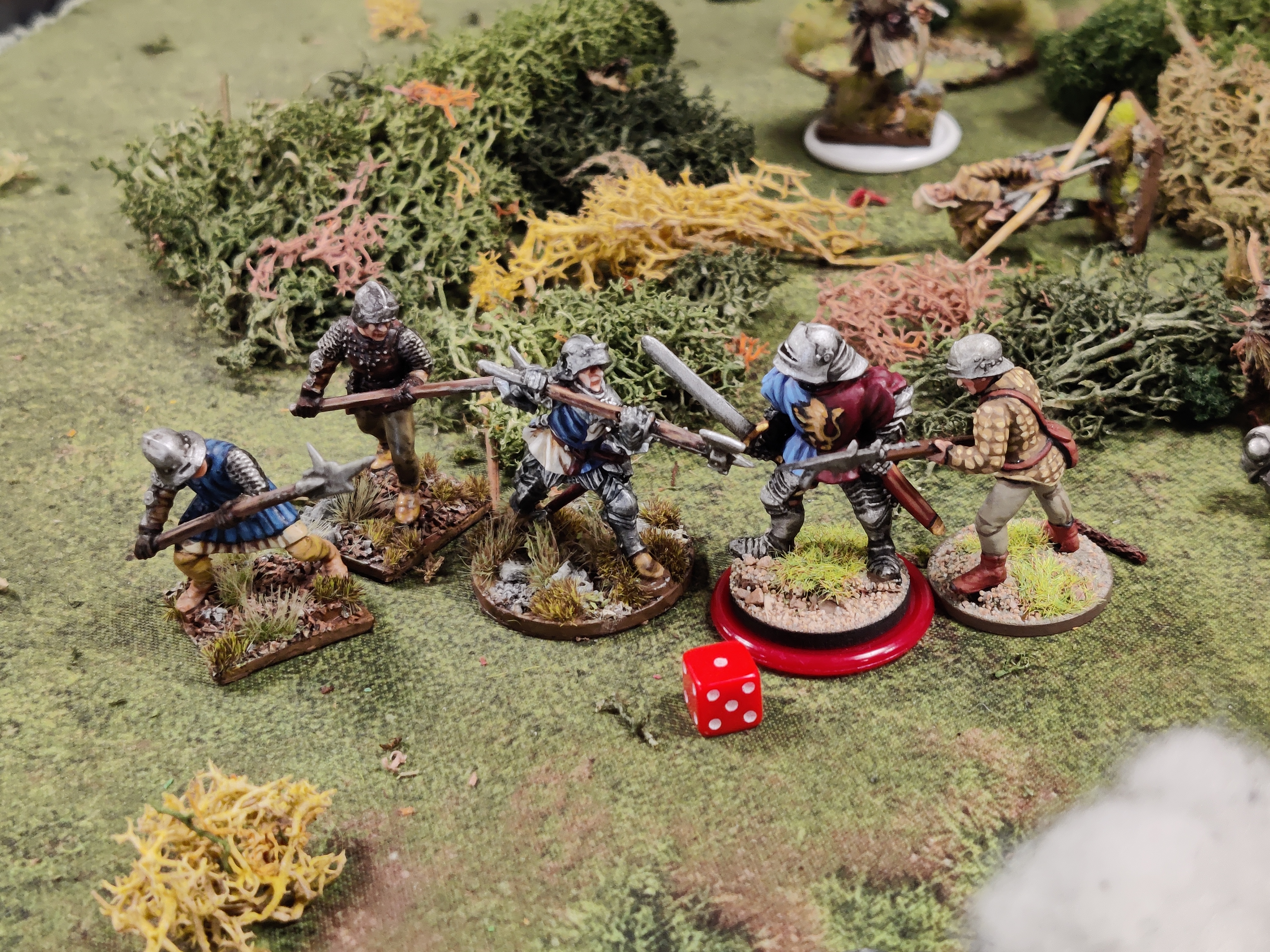 There were a few casualties from desultory volleys of arrows but both sides soon got stuck in. Gaston Villa wounding de Barre in this brief exchange